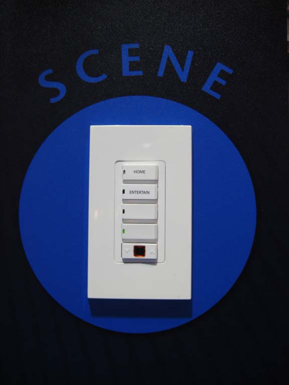 I also took a look at the Leviton Vizia RF scene and zone controllers. The Leviton rep couldn't really tell me the difference between them - he claimed they were the same, but with a different name (I doubt that's the case). The zone controller is a rocker switch (left is on, right is off), but the scene controller is a single-press toggle switch. Leviton tells me they offer custom-etched buttons for the scene controller (very cool), but not the zone controller (??). I believe they both offer an IR input (also very cool).
